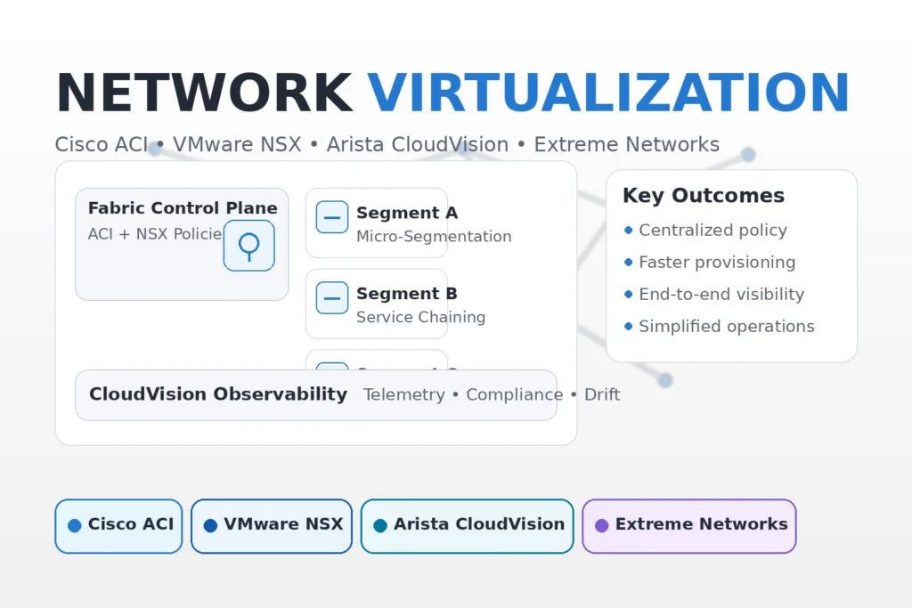 Data center virtualization combines compute virtualization (VMs/containers) with network virtualization so workloads can move safely and consistently. Cisco Systems provides integrated compute and data center networking foundations (UCS + fabric capabilities) that pair with virtualization stacks for standardized operations and segmentation. VMware delivers the core VM platform and software-defined data center capabilities (compute, storage, and network virtualization) for flexible workload placement and policy control. Arista Networks supports virtualization-heavy environments with scalable leaf–spine fabrics, automation, and telemetry for high-performance east–west traffic. Extreme Networks focuses on simplified fabric operations and policy-based networking that can complement virtualized data centers with consistent connectivity and segmentation.